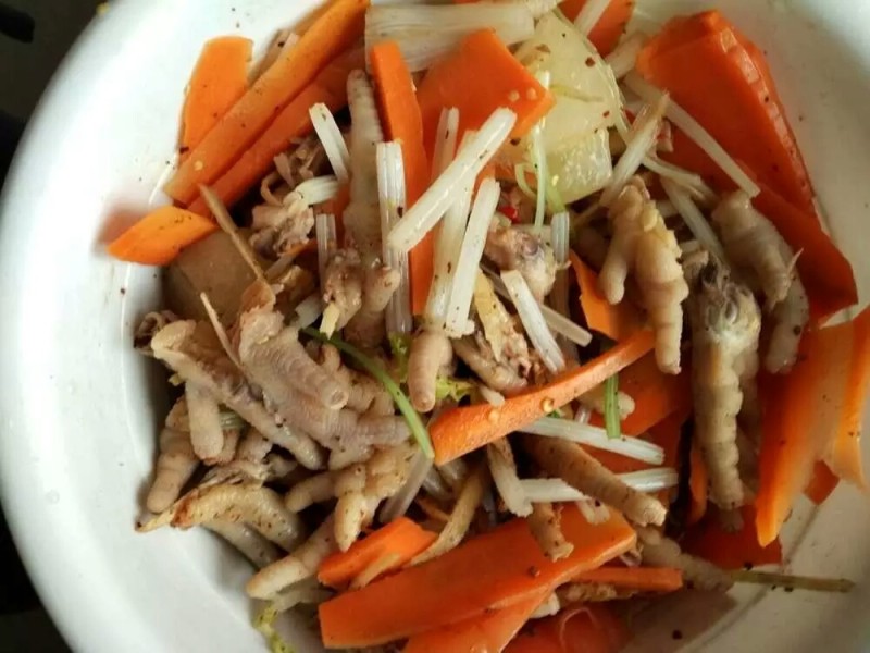 5:捞出鸡脚放入一个大的容器中,放入配菜和泡脚搅拌。