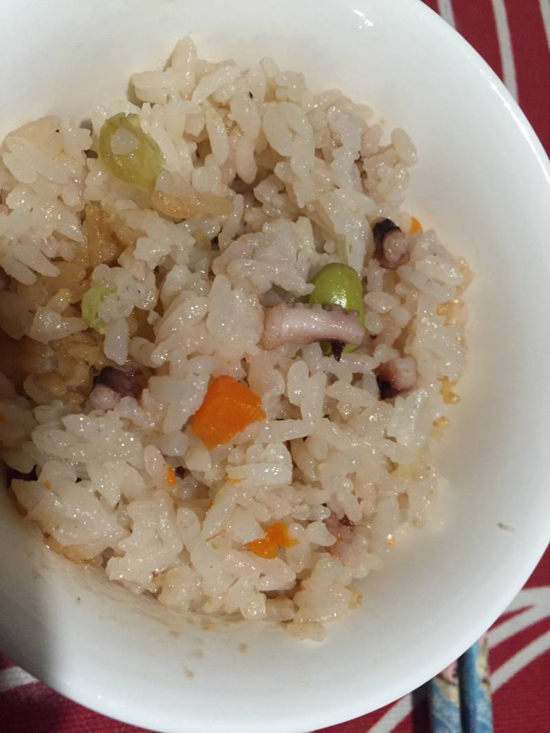 5:把章鱼,胡萝卜切丁放在米饭上,把毛豆放在米饭上,再加入一些干虾米(提鲜,不加也可)。按照一般做饭就可以了。