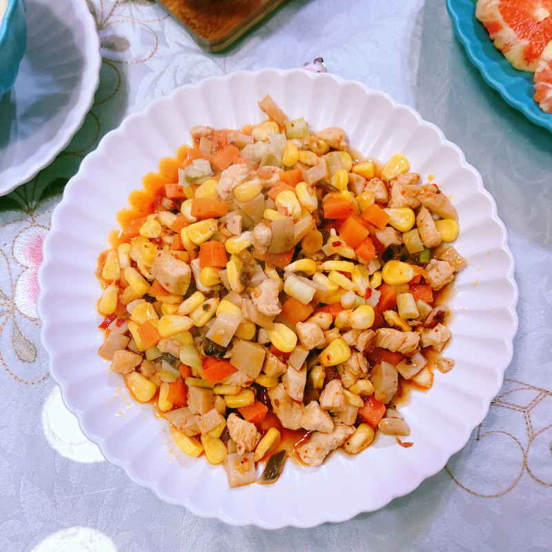 蔬菜可以随意换,我家娃娃比较喜欢吃这俩,推荐青豆和玉米花生一起,鸡胸腌一下会很嫩,不过不喜欢嫩的也可以直接炒。