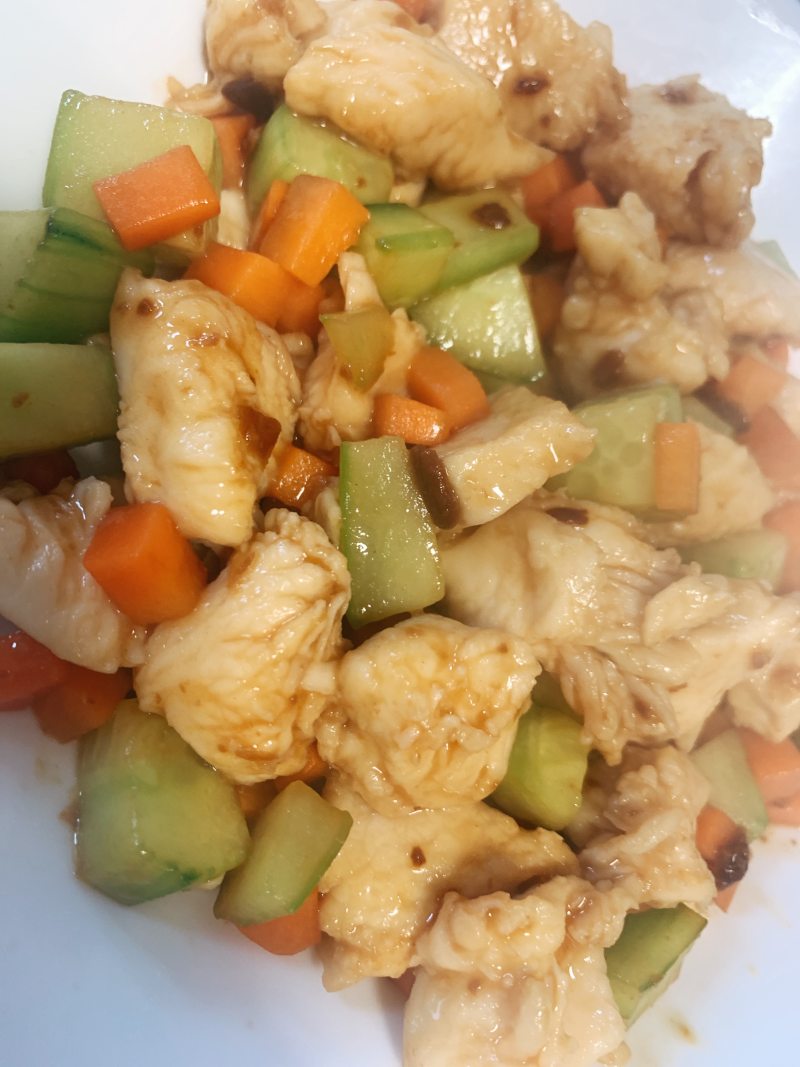 3:然后加入鸡胸肉,翻炒,因为鸡胸是熟的,黄瓜和胡萝卜断生即可。