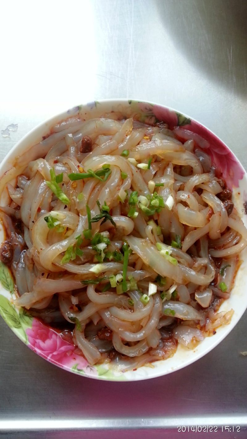 9:切薄片加入油辣椒盐醋葱蒜味精美味鲜麻油
