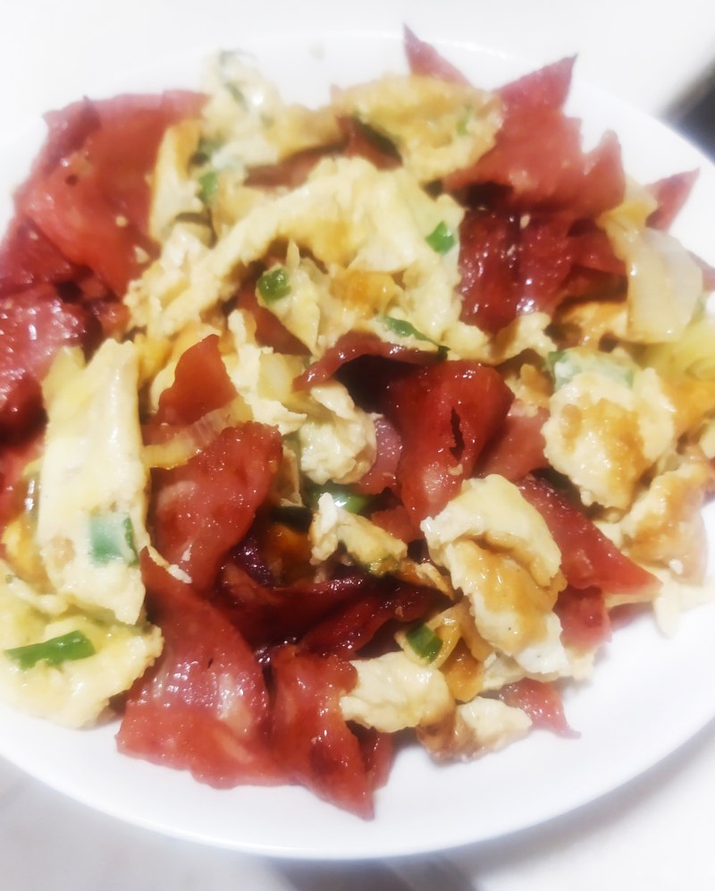 3:待鸡蛋炒至微微焦黄色后倒入火腿、大蒜、培根,然后翻炒均匀。