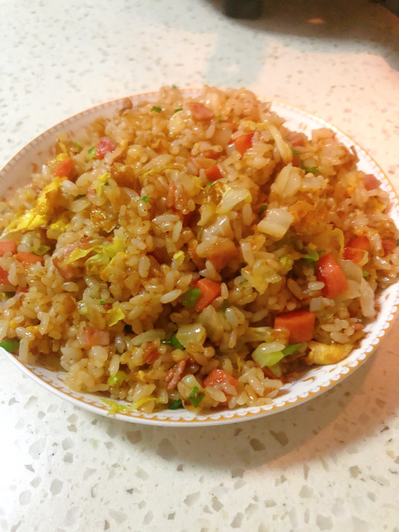 培根炒饭时,可以不用加火腿肠,只是应孩子的要求,我的炒饭就有加。我这个是做的三人量的炒饭。大家根据自己的需求自行调节。