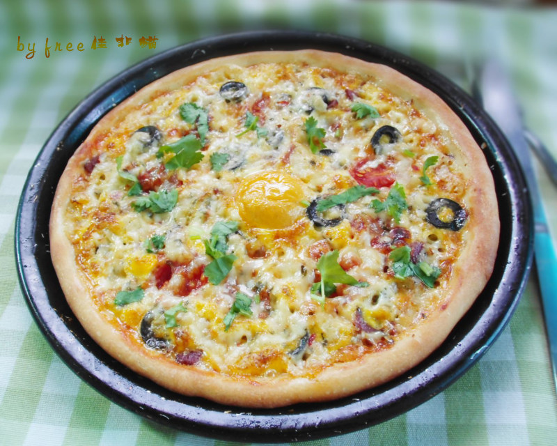 13:撒上橄榄,然后铺上奶酪条,入烤箱烤18分钟;(时间仅供参考)