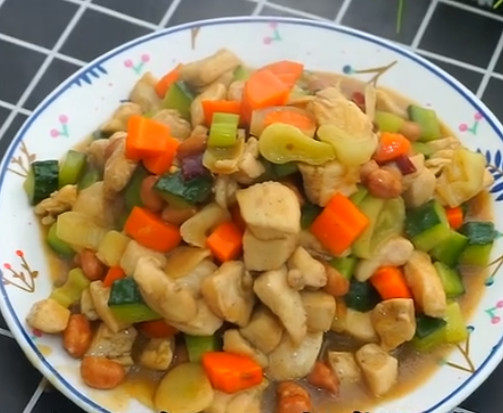 6:倒入黄瓜,胡萝卜翻炒至断生,倒入调好的酱汁炒匀,最后加入炸好的花生米翻炒均匀即可。