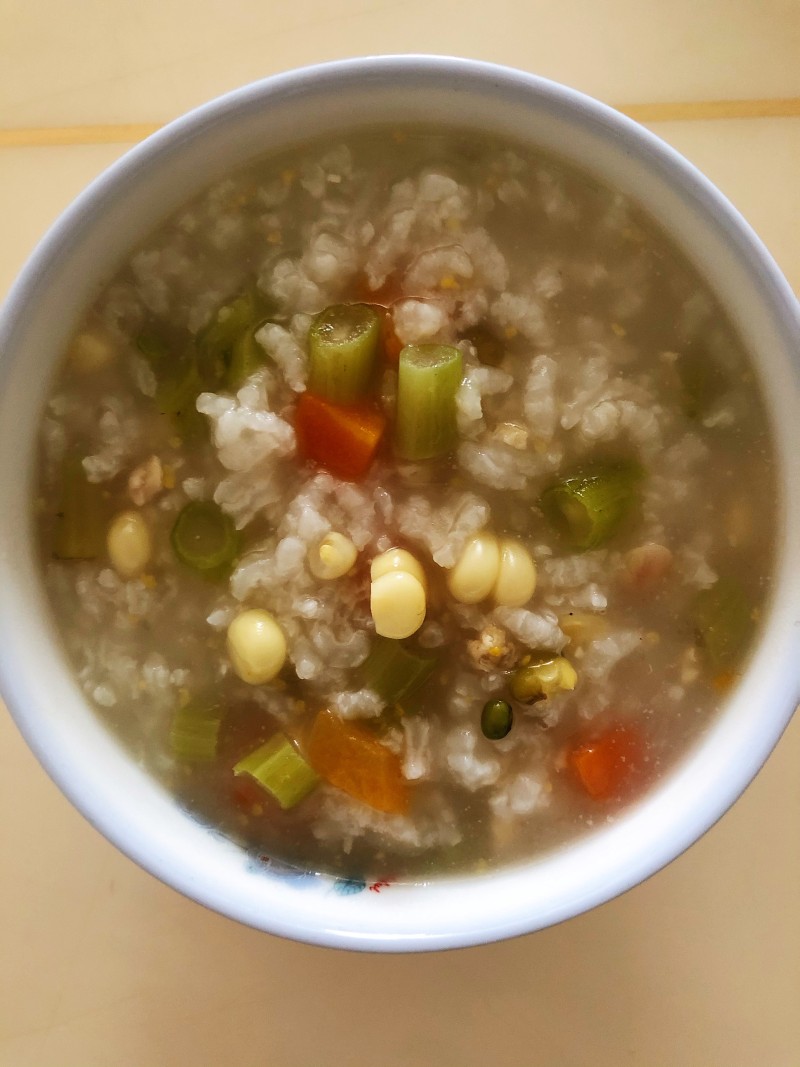 4:大米洗净以后放入绿豆和切好、炒好的配菜。