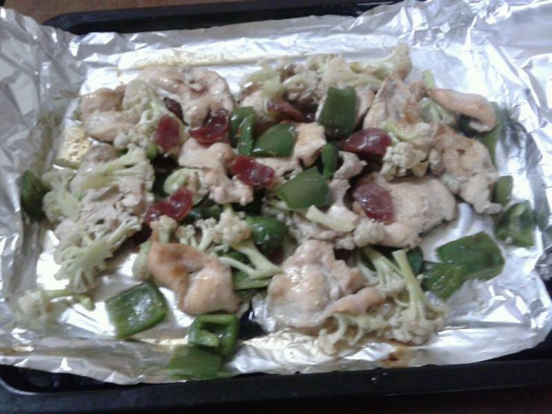 鸡胸肉适量;香肠适量;花椰菜适量;甜椒适量;