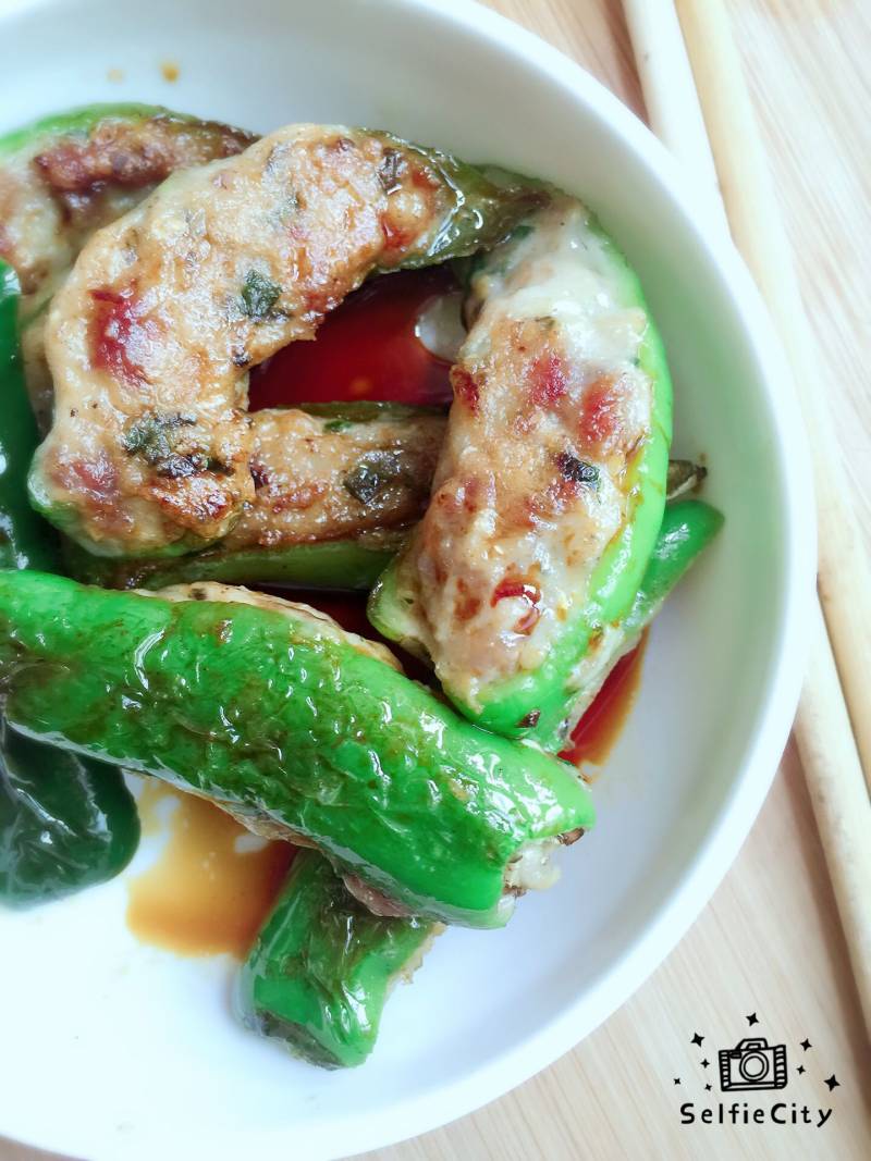 3:热锅,放油,逐一摆入酿好肉的辣椒。为上色均匀,可以关火再摆,待全部都放进去再开火。