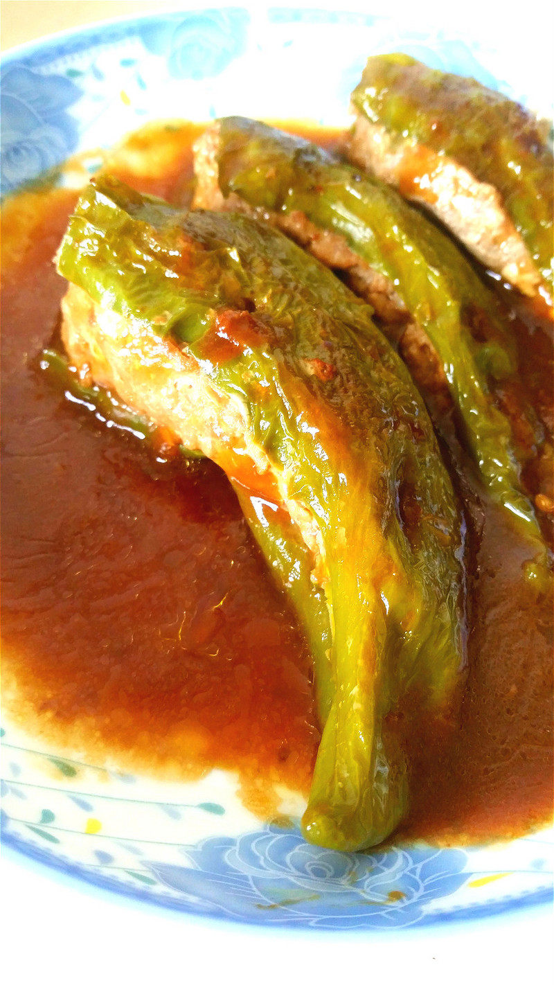 9:肉馅熟透把料汁泼进锅里,趁热把汤浇在辣椒上,均匀就可以关火装盘。颜色不好看,可味道很赞。
