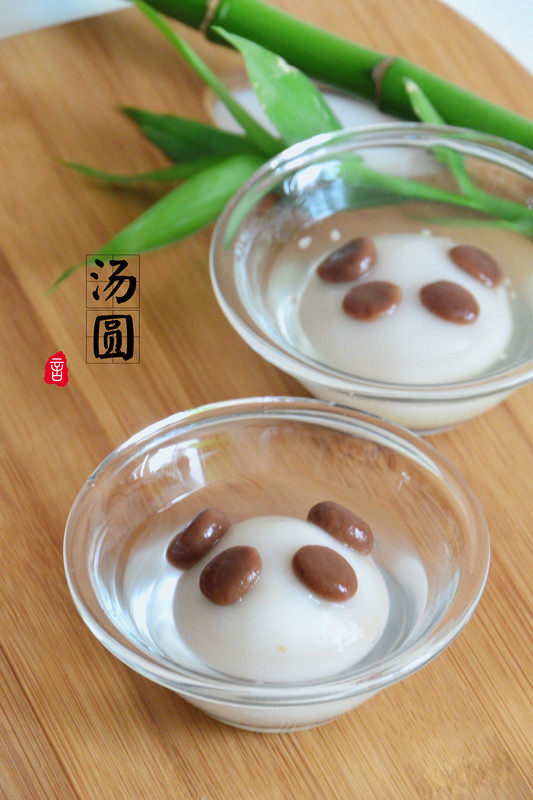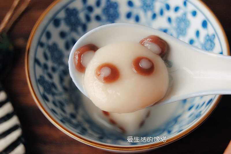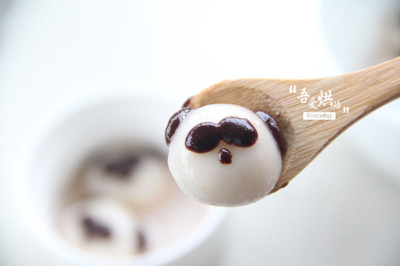 23:用墨米粉团做好眼睛、嘴巴、耳朵,装饰在汤圆上,即成熊猫汤圆