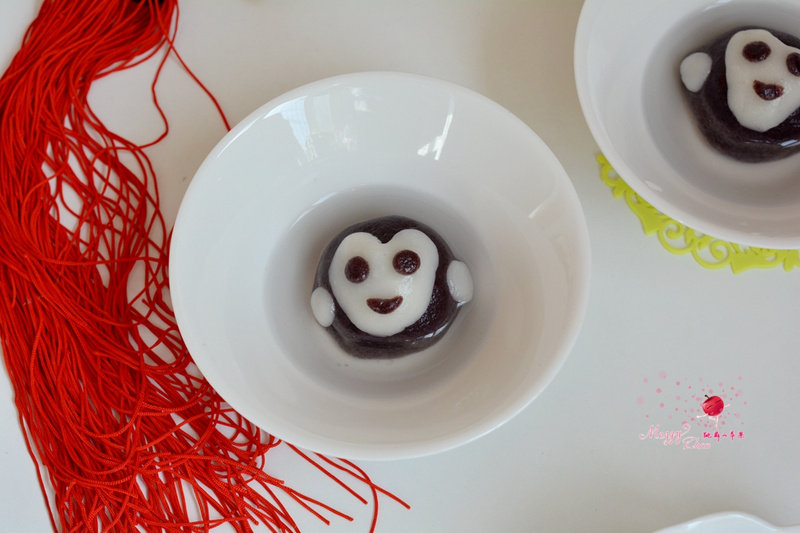 这些材料一共做了18个带馅大汤圆,12个不带馅的小汤圆,所有材料的用量请视自家的食用量来调整;糯米粉的吸水率不同,所以配方中的水量只是一种参考,不要一次性将水全部加到粉中,特别是最后的时候要一点点加入,才能调到自己满意的柔软度;将包好的汤圆放在保鲜膜或者保鲜袋上,拿取非常方便,不会破相;整个操作过程中不需要撒干粉;开水下锅,小火煮熟,不要让水翻滚得太厉害,否则有可能会使汤圆破皮;猴头和熊猫的五官装饰不用抹水,做好造型直接按在上面即可,粉团里面的水会使它们很好的粘合在一起的;大理石花纹的汤圆也可以将两种粉团搓成条状,然后拧在一起,更加省事;此做法只是增加汤圆的乐趣,如果嫌麻烦可以直接包成圆球状,不做任何造型