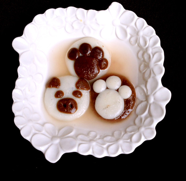 5:最大10克面团压扁,5克的面团压扁蘸水贴在上面做肉垫,3个小面团蘸水压上去做(做的过程忘记拍照了)颜色错开做,即可。煮一锅水,水开了一个个下汤圆,汤圆浮起来后再煮半分钟即可食用。