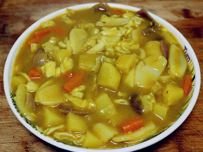 年糕300g;胡萝卜半个;土豆1个;洋葱1个;圆白菜100g;咖喱3块;