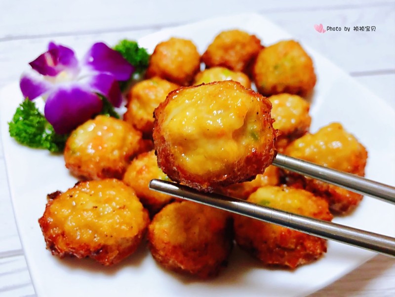 9:锅中倒入适量油加热至七成热依次放入丸子中火炸起来。