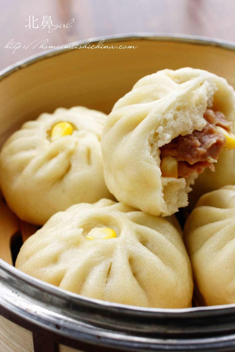 调馅料少量多次的加水有助于去腥,也是包子馅鲜嫩多汁的秘诀。蒸包子的时间要根据自己包出来包子的大小适当增减,时间到了以后不要马上揭开锅盖,关火焖个3—5分钟效果最好。我做面点时喜欢加点粗粮面进去,这次加的玉米粉,比例大概为4比1到3比1之间,加太多不容易成型,口感也会太粗糙。