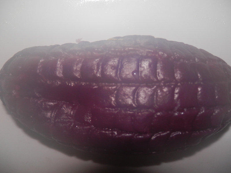 9:用紫薯皮包住发面裹的园包,并初步整形成玉米状