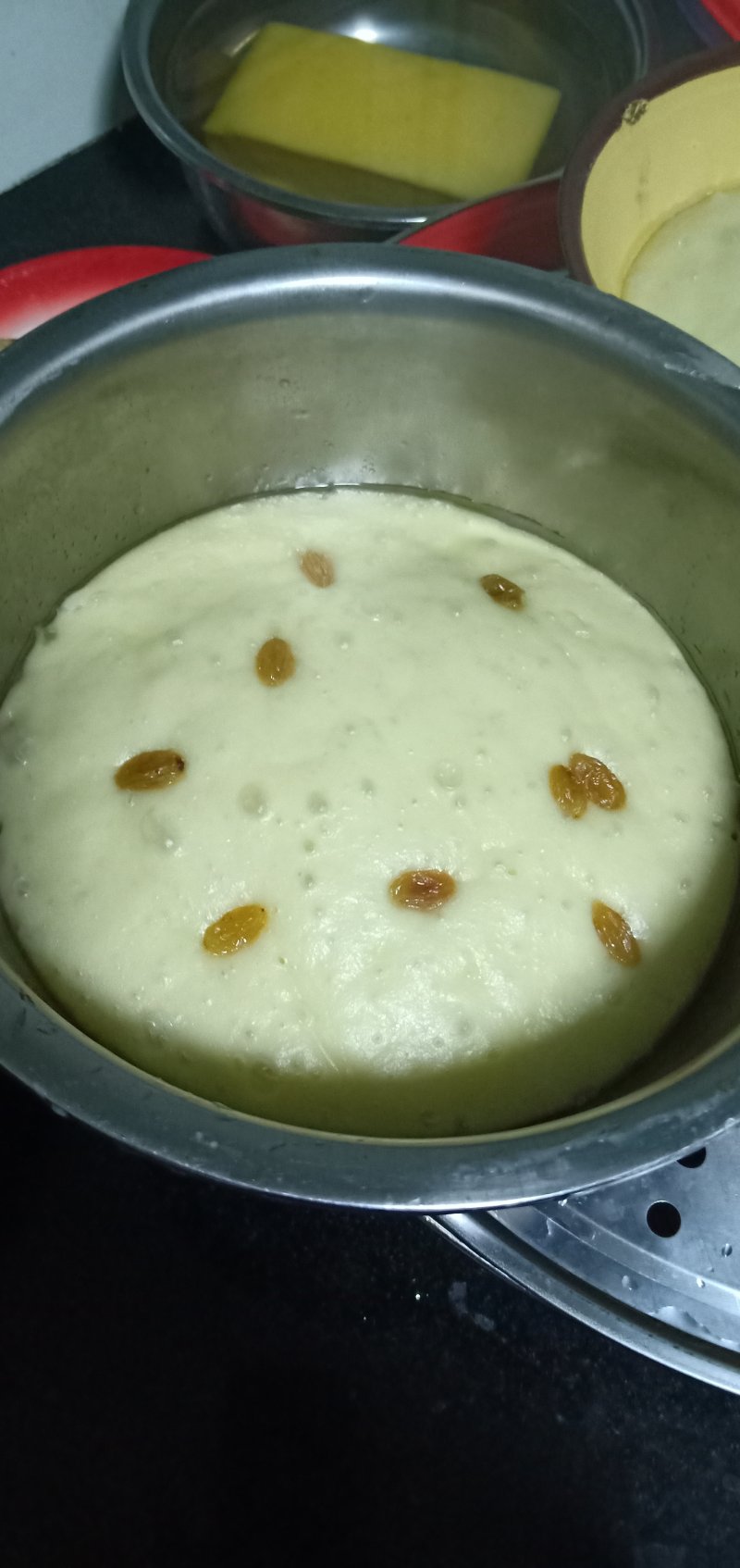 5:把它用筷子搅拌一下排气,放到涂了油的器皿中,然后二次发酵20分钟,在上面撒几颗葡萄干,冷水上锅蒸,水开后蒸20分钟关火,再虚焖5分钟就可以出锅了。