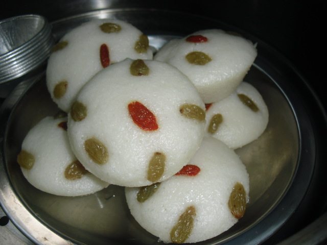 粘米粉,250克;酵母4克;糖4勺;葡萄干适量;