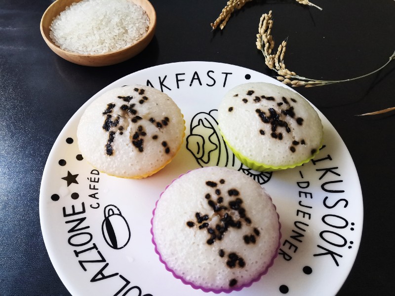 11:发酵完成的米浆糊,用筷子搅拌一下,然后倒入小碗中,要七、八分满就可以,水开后上锅蒸20分钟即可,晾凉了就可以拿出来吃啦(可以在碗里撒点黑芝麻)。