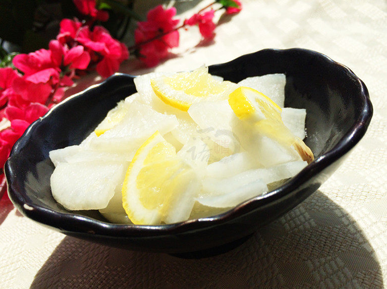 4:腌好的萝卜挤干水份,加入切好的柠檬片、柠檬水、白糖、白醋。