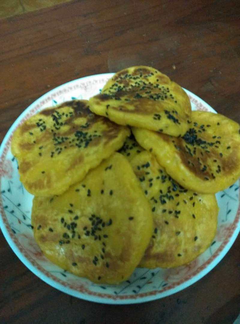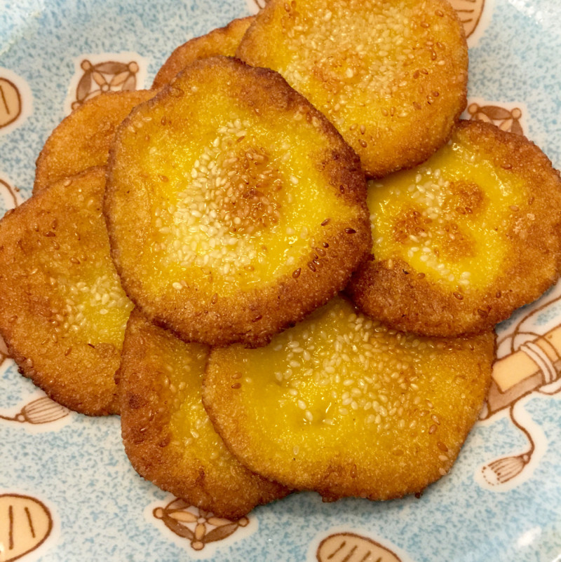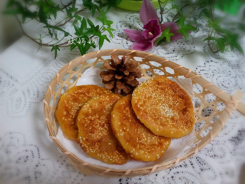 1:南瓜去皮蒸熟,晾凉用勺子碾碎,加糯米粉和一点白糖,白砂糖揉成面团。均匀将面团分成若干小面团,擀成饼,撒芝麻。可在南瓜饼上刷食用油,冰箱冷藏一会儿,煎的时候不粘锅。