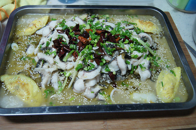 19:把热油往鱼肉上面这么一浇!滋啦一声~然后撒入葱花和白芝麻就行啦!我放了几个蛋饺在里面还蛮好吃的,嘿嘿!