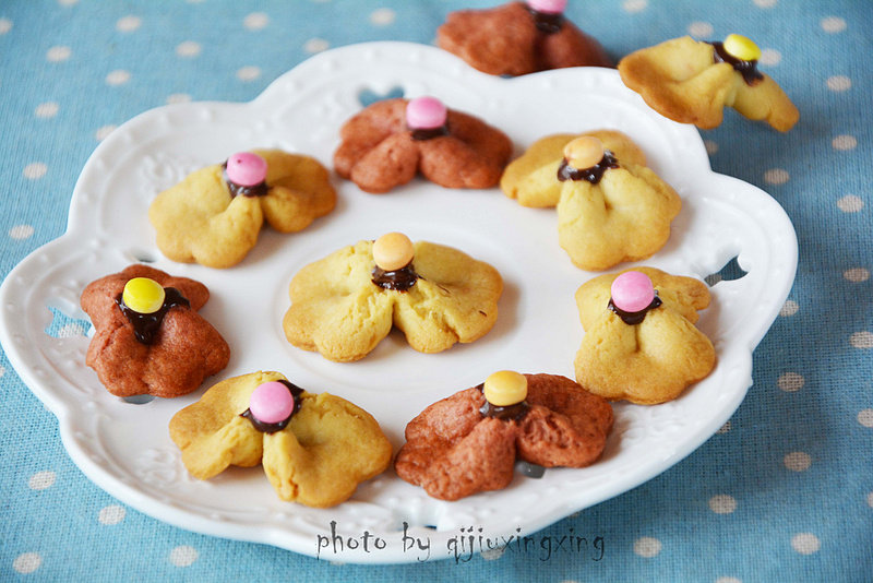 15:取一块冷却的饼干,中间涂上巧克力,放上小糖果即可。