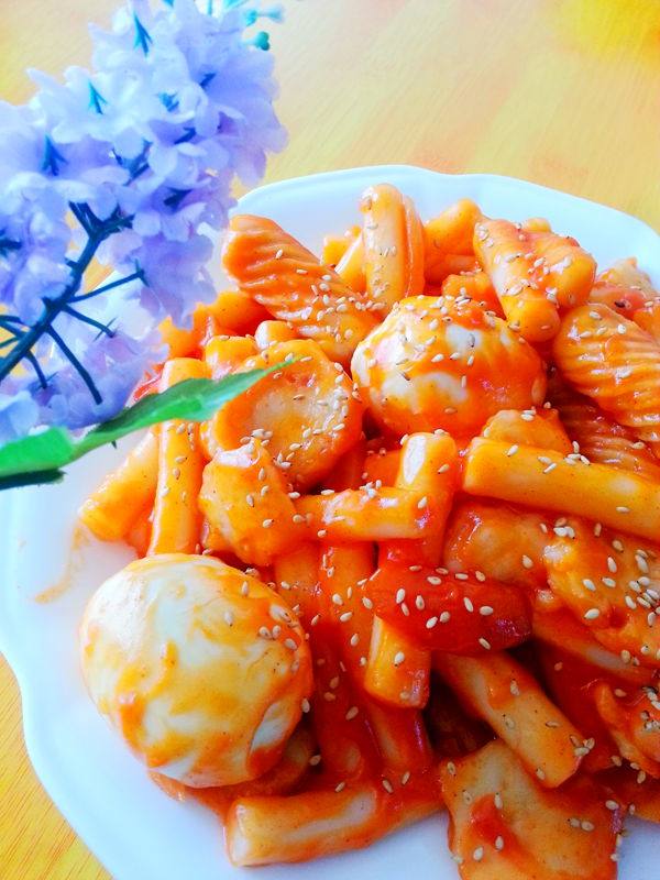 1:所用材料:年糕一袋、韩国辣椒酱、亨氏番茄酱、鸡蛋2个、鱼丸150g、胡萝卜一根、圆葱半个、白糖少许、蒜少许、芝麻少许。