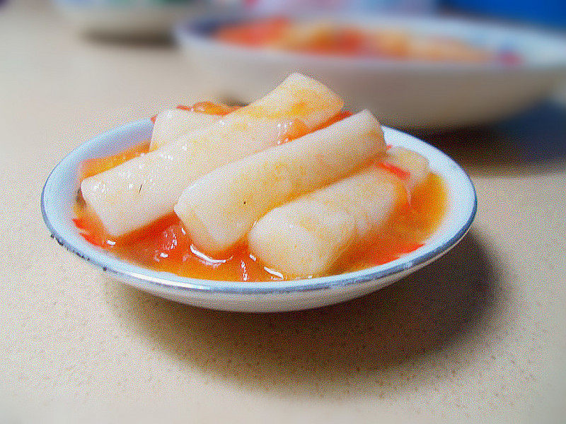 5:水开后,加入年糕条,小火加盖煮1分钟,加盐调味即可。