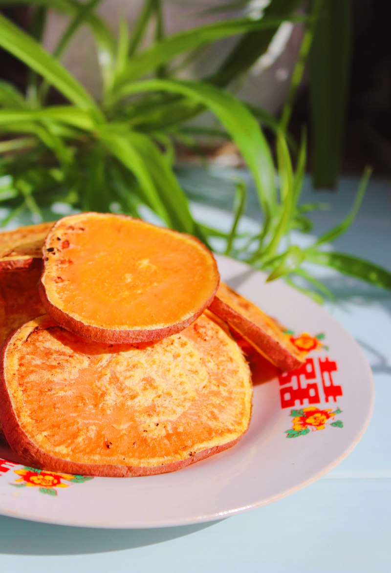 5:这时候红薯片基本上已经烤熟了,表面已经呈现焦花。但是还不够,翻面再烤2分钟,然后不要急着出锅装盘。先关掉电源焖3分钟,利用电饼铛的余热继续烘烤使红薯片更香甜软糯。