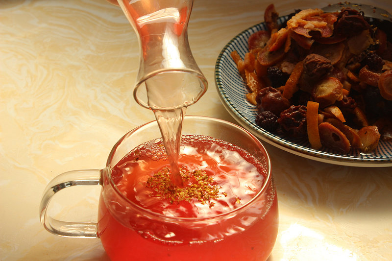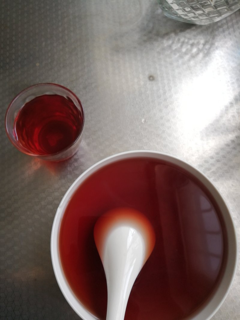 6:为了颜色更好看革新一下,加入几朵洛神花煮5分钟左右,这样酸度会再增加一点,关键是颜色会很漂亮