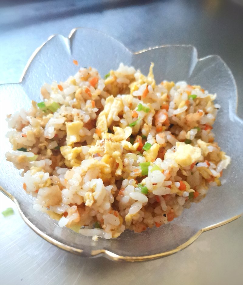 米饭1碗;虾仁6只;胡萝卜1只;鸡蛋2只;