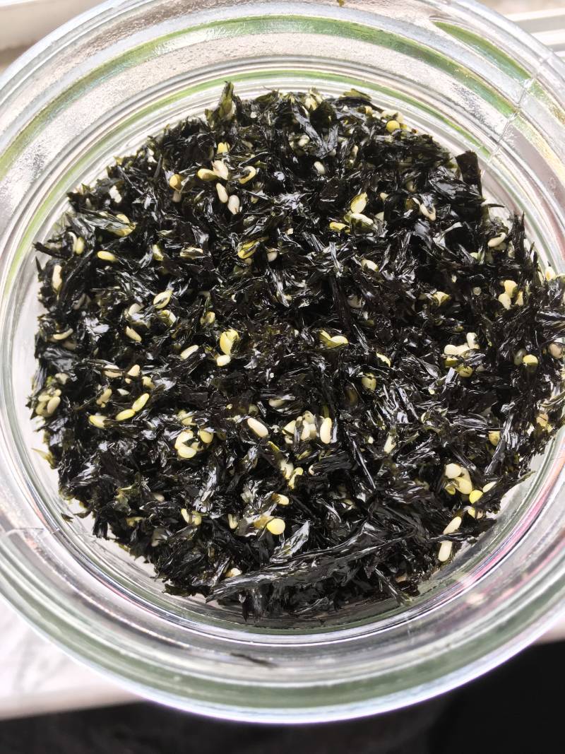 1:将整块的紫菜掰成小块,放入食物料理机中打碎