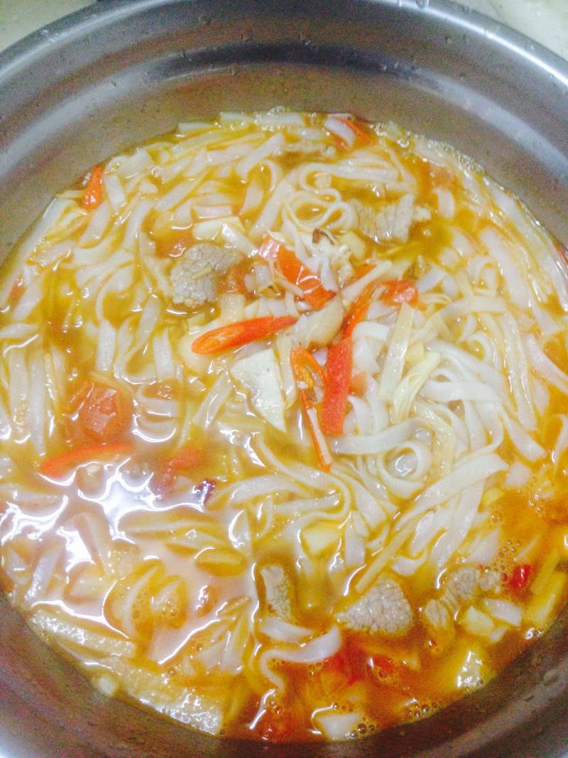 2:锅内加油烧热,放入酸笋、西红柿、豆豉、蒜米、姜、干辣椒炒香,然后加入蚝油、酱油、盐、糖翻炒一会,加入半碗水,烧开后倒入煮好的面条。再次烧开,即可出锅。