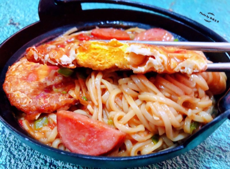 11:美味可口的煎蛋番茄香肠面装入容器中就大功告成了。