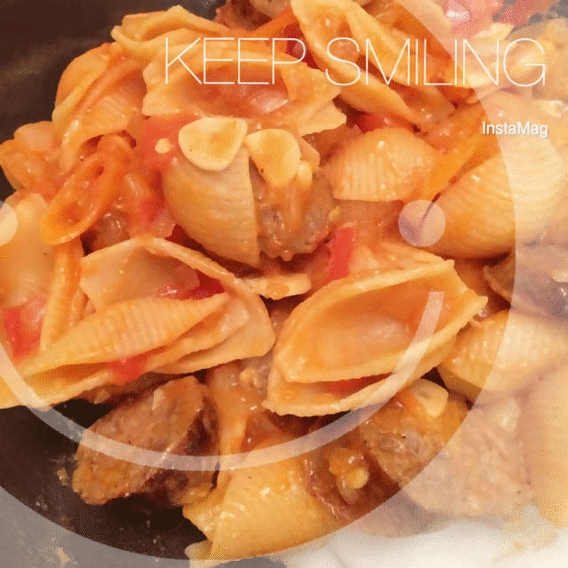 9:放入煮好的贝壳粉(煮意面可以从煎香肠时候就另外烧一锅水煮意面,因为意面要煮很久,大约9-15分钟,根据种类而定。煮意面的时候国内要事先加入适量的盐和几滴食用油,水开下面。煮熟之后捞出直接放入酱料里翻炒,不用过凉水)。
