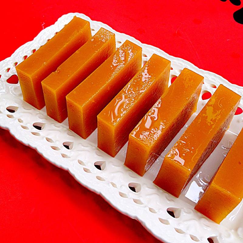6:取出冷藏好的凝固南瓜凉糕,切块摆盘完成。