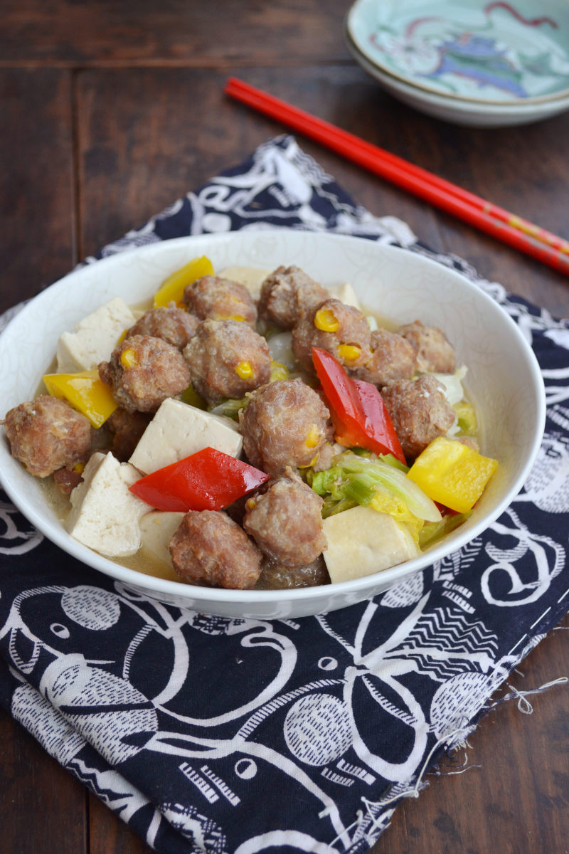 猪肉馅300克;鲜玉米粒适量;老豆腐1块;鸡蛋半只;葱姜蒜各10克;小米椒3个;彩椒几片;娃娃菜半棵;高汤1碗;