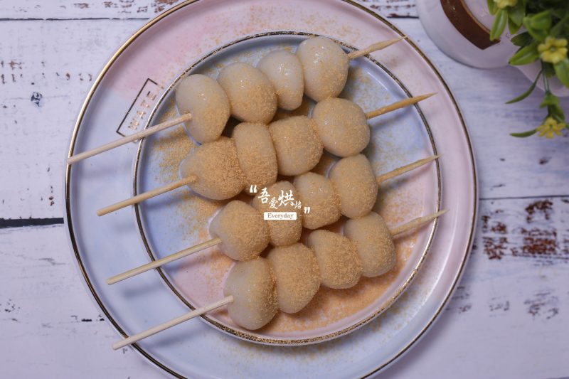 5:捞出丸子,放入冰水降温,并用竹签串起。