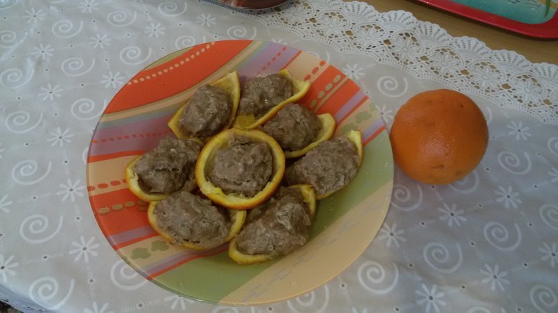 3:把蒸锅上笼屉洗净,摆放橙子皮,用小勺,把调好的肉馅放在橙皮上。
