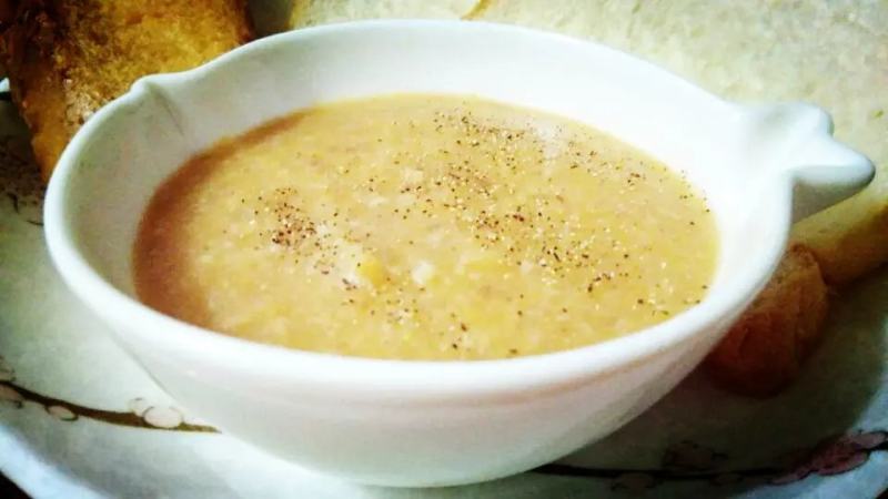 7:蔬菜汤煮涨关火。把汤倒入料理机搅碎至细粒(看个人搅碎至什么程度),倒入汤碗,撒上黑胡椒粉,就可以开吃了。建议配上蒜蓉法棍片