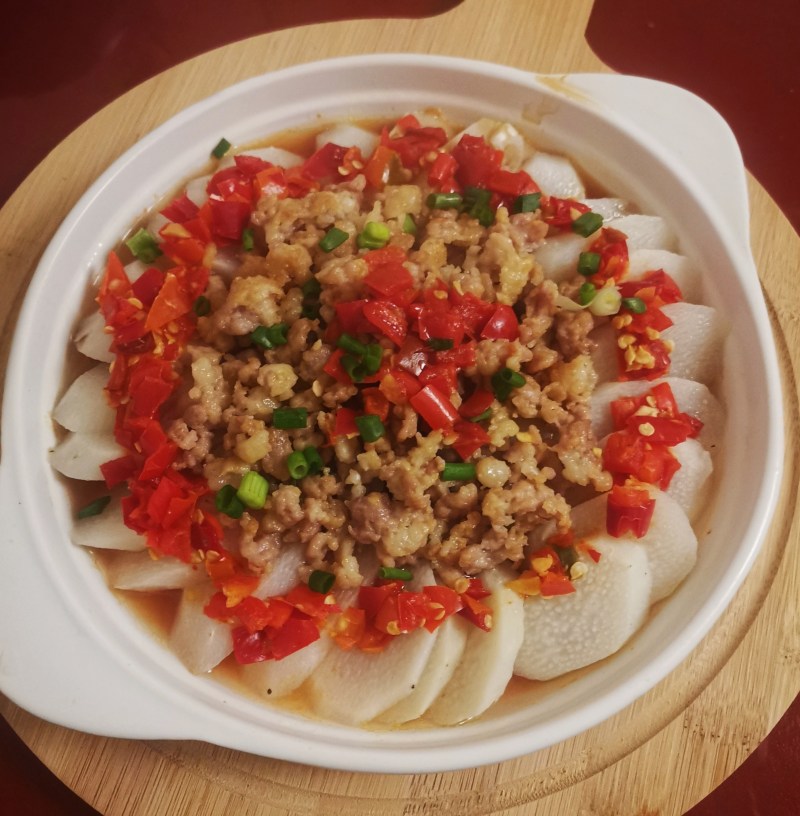 12:蒸好的山药肉丸立即出锅,将芡汁淋在山药片和肉丸上,再撒少许青蒜叶或者香葱末,香气扑鼻,肉丸结实入味解馋,山药片软糯自带微甜,无油少盐的一道“蒸蒸日上”,男女老少皆适宜,尤其更受讲究养生的老年人喜爱。