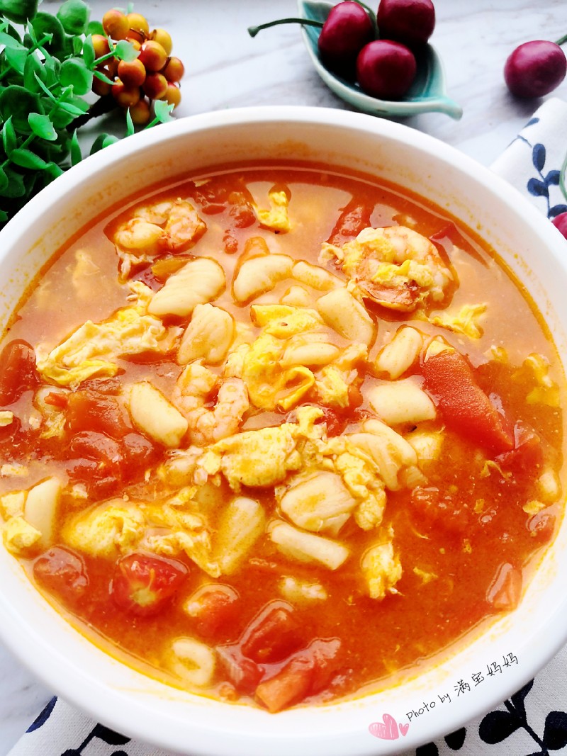 面粉适量;清水适量;西红柿(小号)两个;鸡蛋一个;虾仁几个;