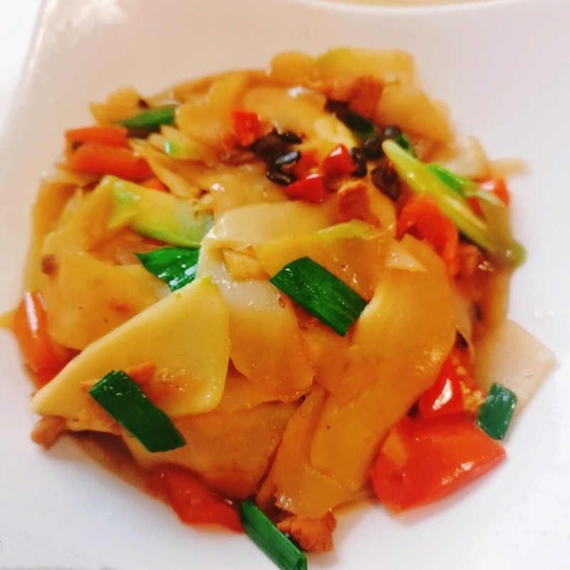 9:加入辣椒和蒜苗,翻炒断生,加盐、鸡精、蚝油、生抽调味,翻炒均匀。