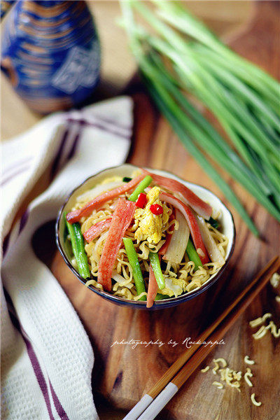 公仔面4包;蟹味棒100克;韭菜一大把;火腿2条;鸡蛋2个;新鲜辣椒1个;