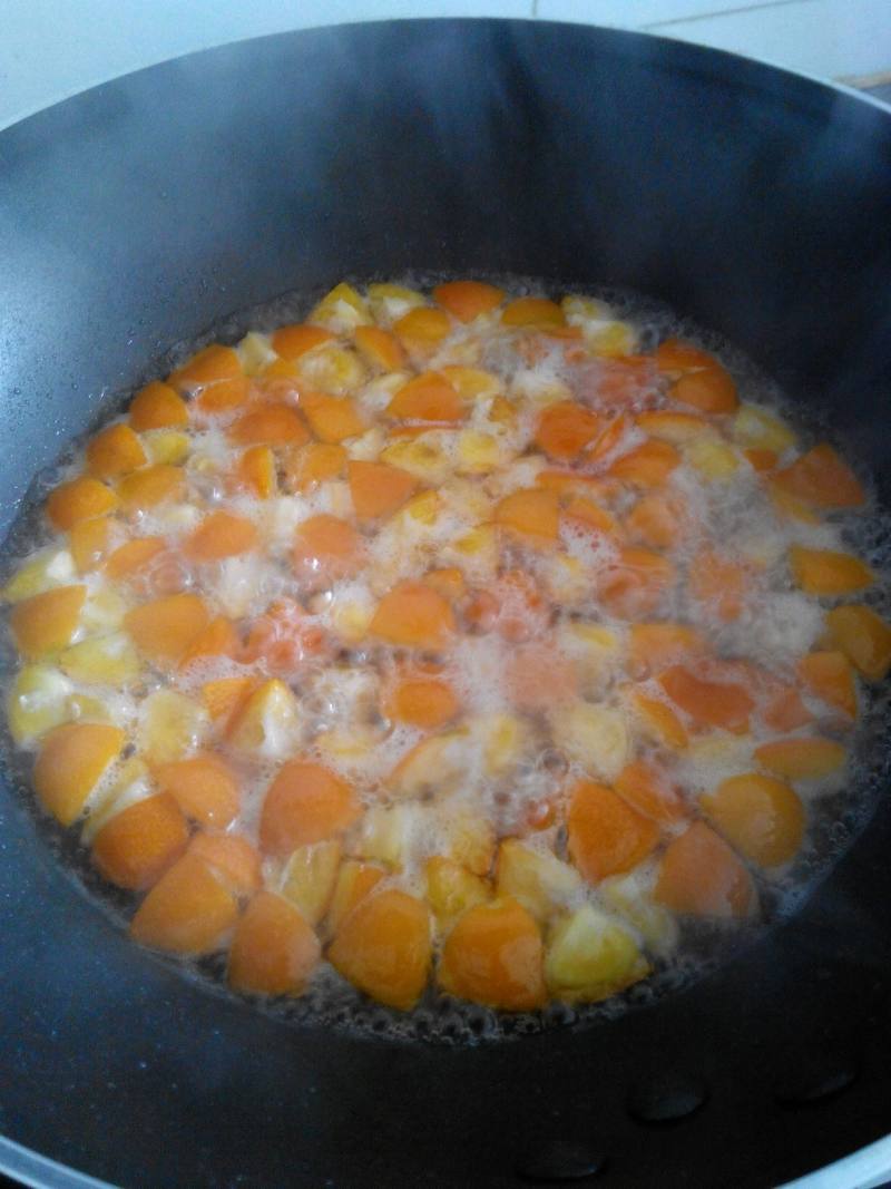 1:先熬糖,起泡后加入切好的金桔,注意金桔表面水擦汗,核剔除!