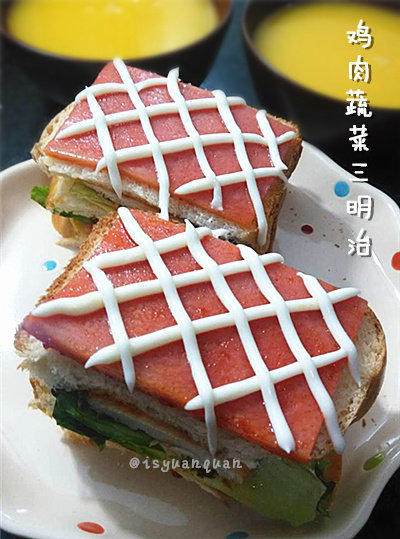 切片面包10片;鸡胸脯肉300g;生菜适量;火腿片适量;鸡蛋3个;番茄酱适量;