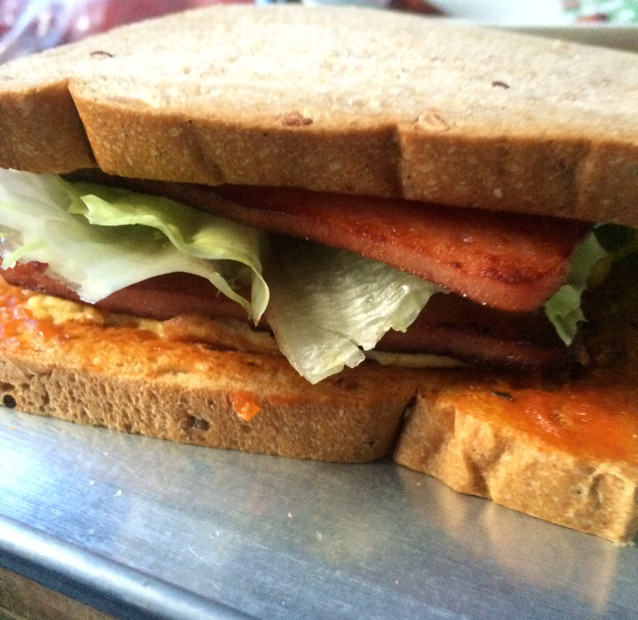 7:再盖上2片生菜叶,这个三明治基本就准备好了。食材不固定,可以换成自己喜欢的各种食材,好吃才是目的。