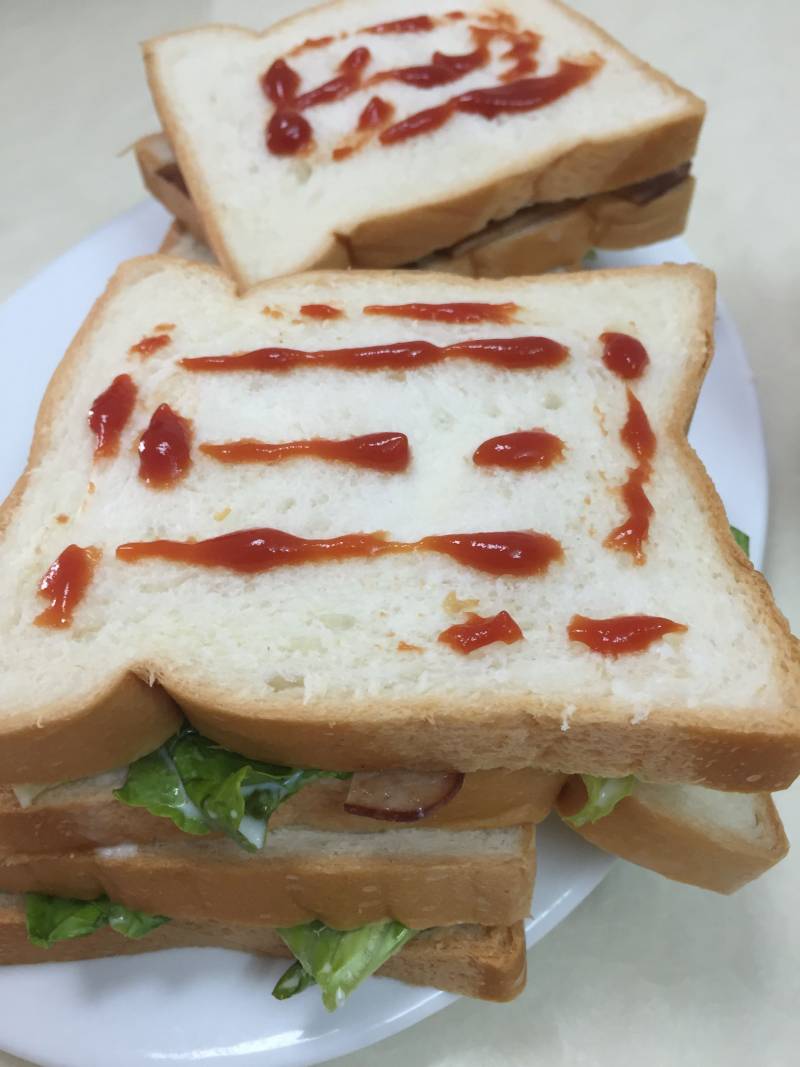 10:面包上抹番茄酱,也可以抹沙拉酱或炼乳什么的,随自己喜好就行。