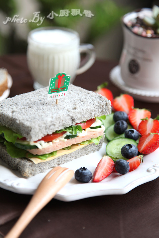 黑芝麻粉土司2片;奶酪一片;午餐肉2片;生菜2片;黄瓜适量;西红柿适量;沙拉酱适量;